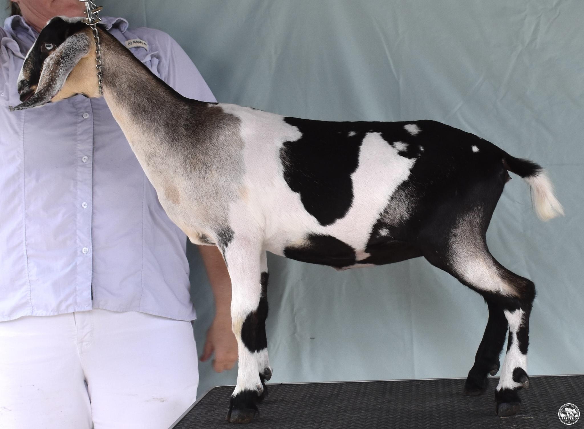 She captured 2nd place in one ring for her uphill stature, strong chine, and impressive body capacity, as well as 3rd place in the other ring for her long, level topline, correct rear leg angulation, and strength in her forelegs—a strong showing for this young doe against tough competition.